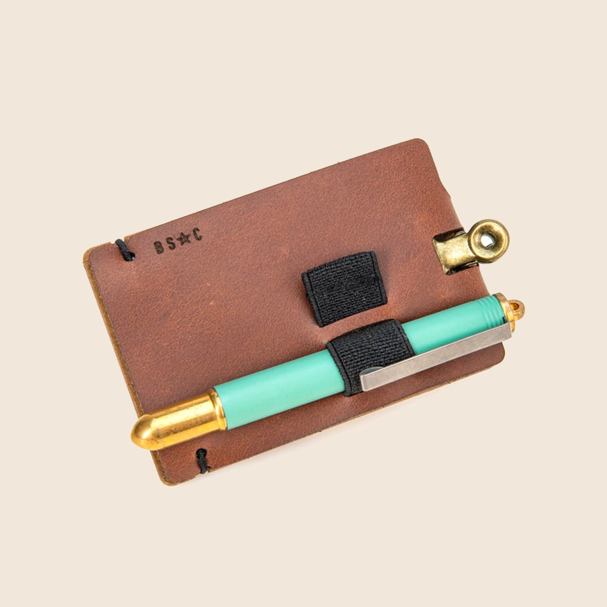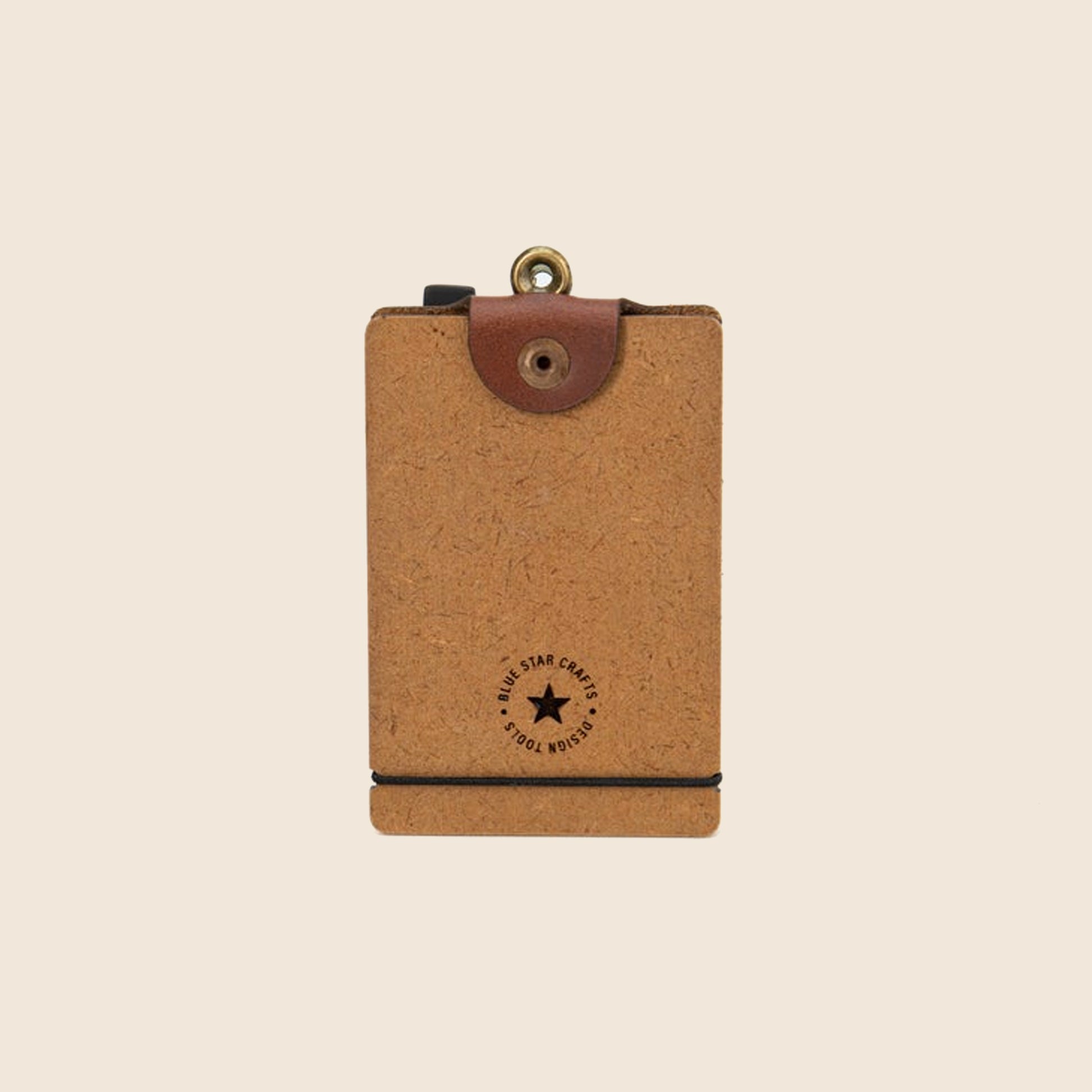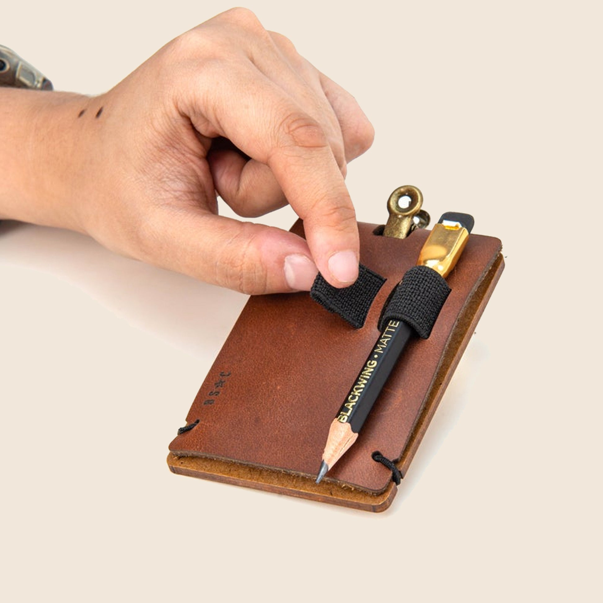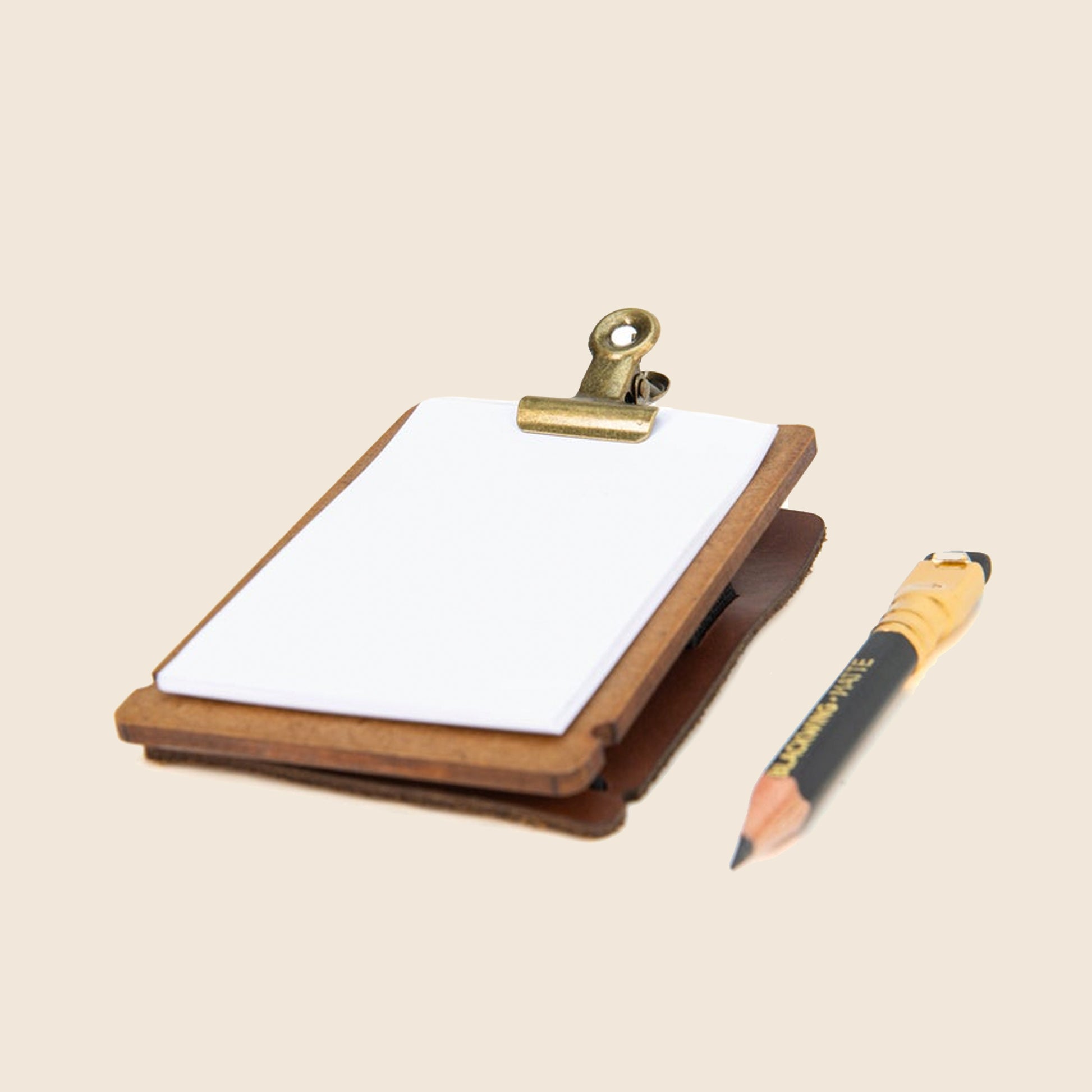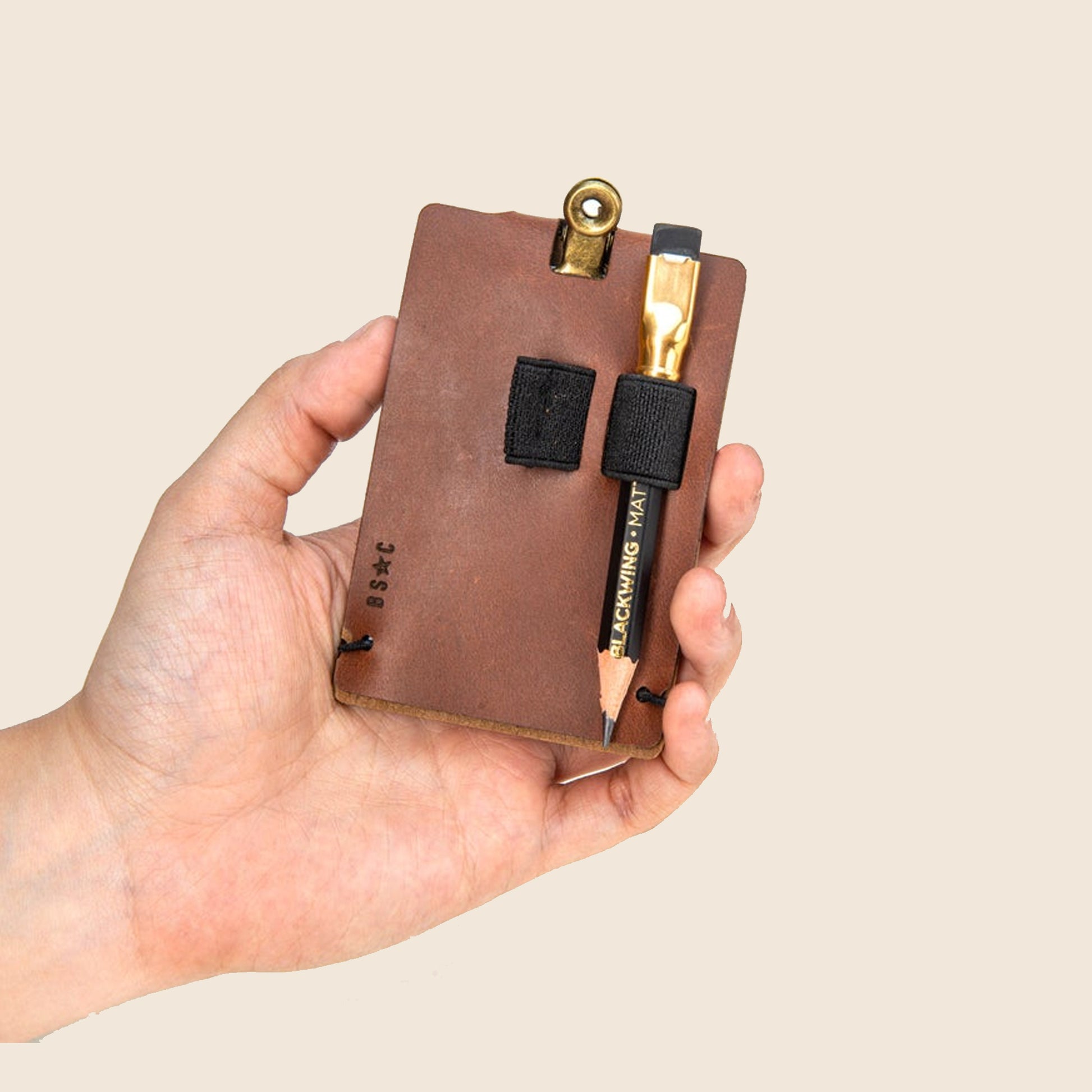 This mini pocket size notepad is made with fiberboard, genuine leather and a brass mini clip.