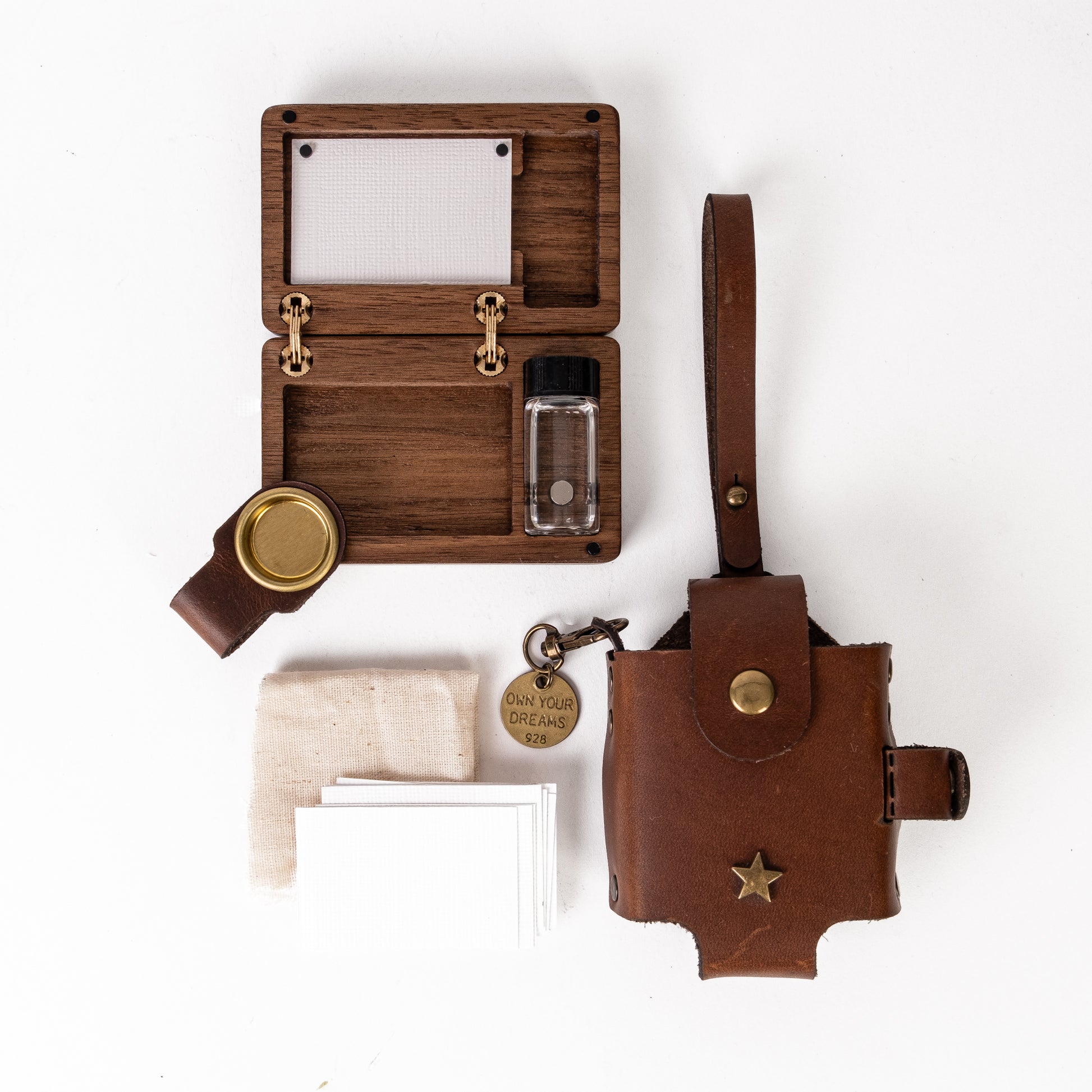 - Leather holster with a keychain(may vary), a mini water bottle and piece of cloth for cleaning your brushes.