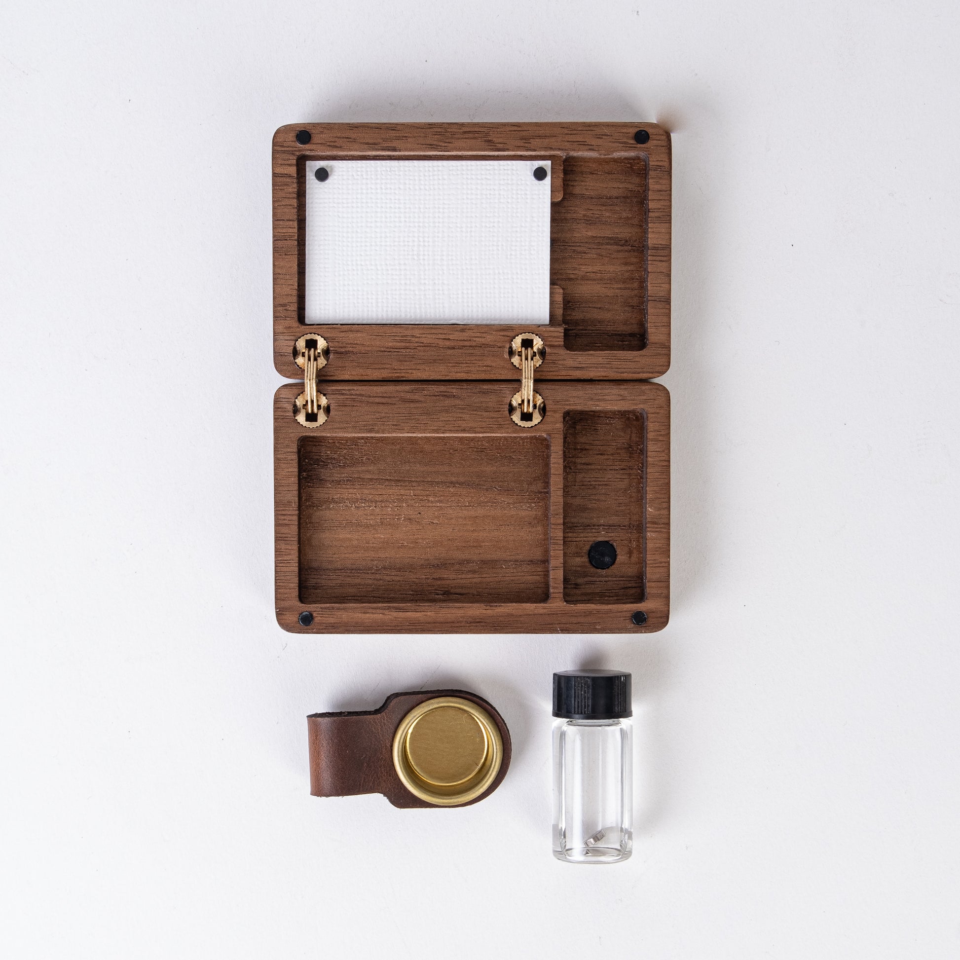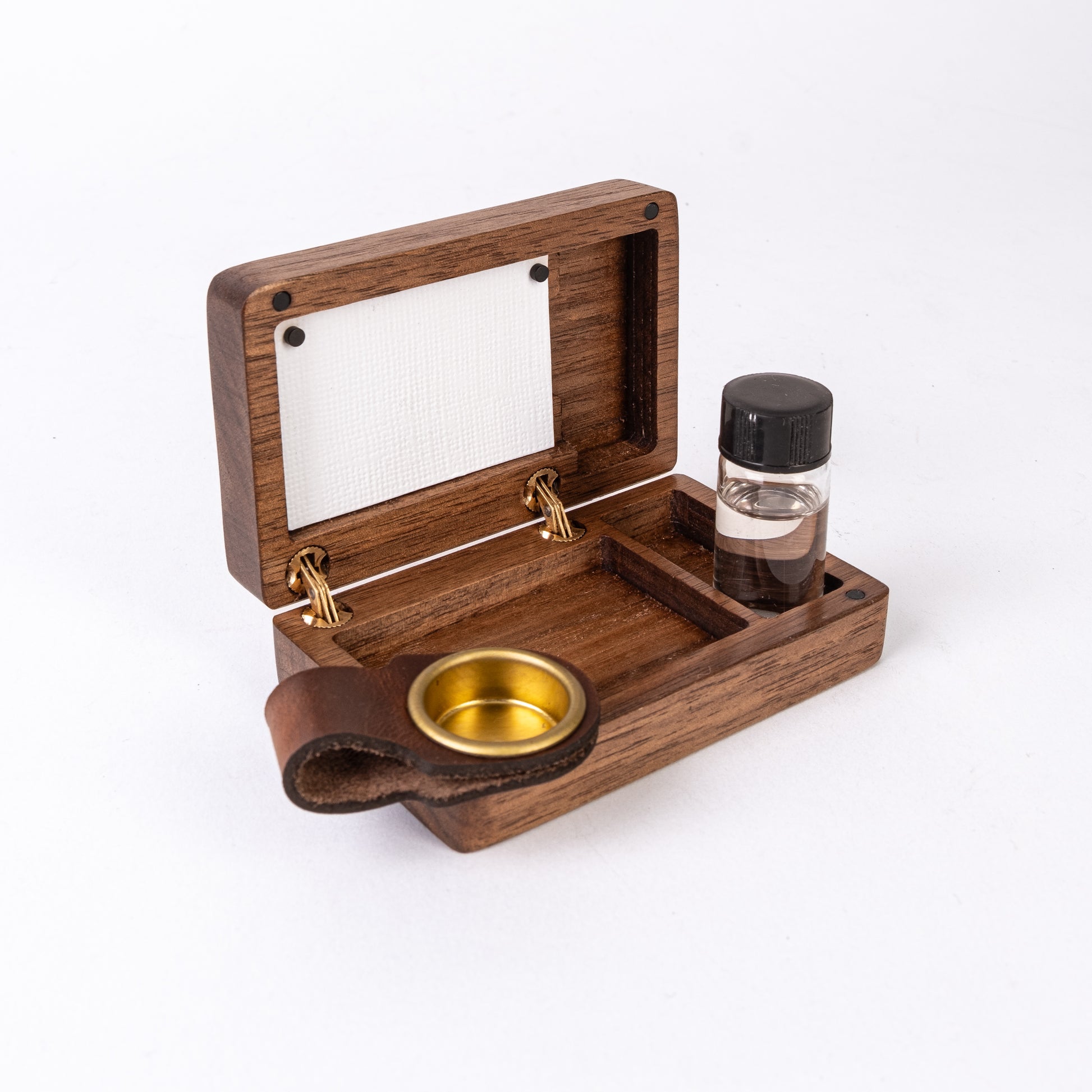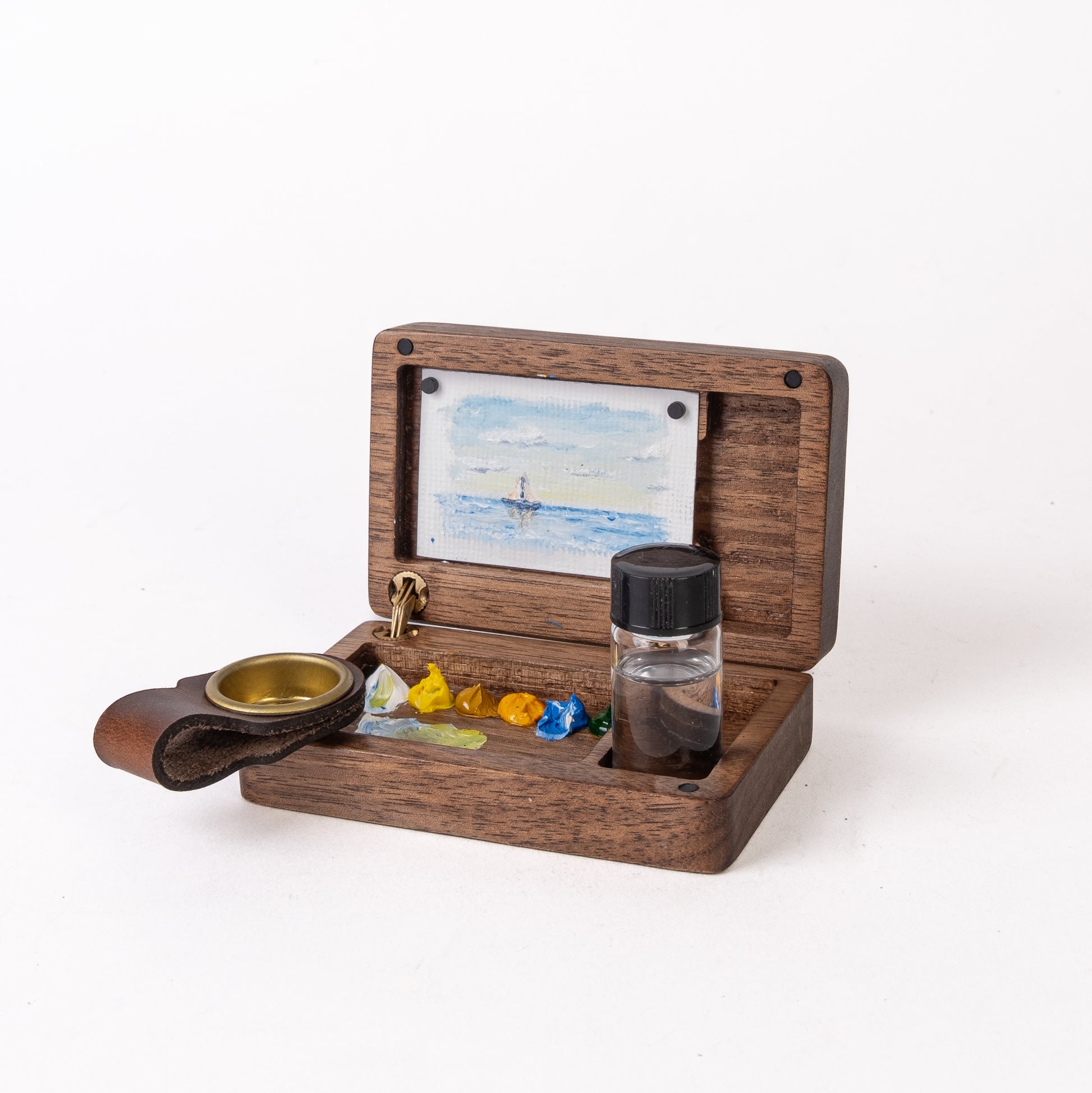THE NEWEST PERFECT TRAVEL SIZE MINI OIL PALETTE, MADE FROM A NATURAL BLOCK OF SOLID WALNUT WOOD.