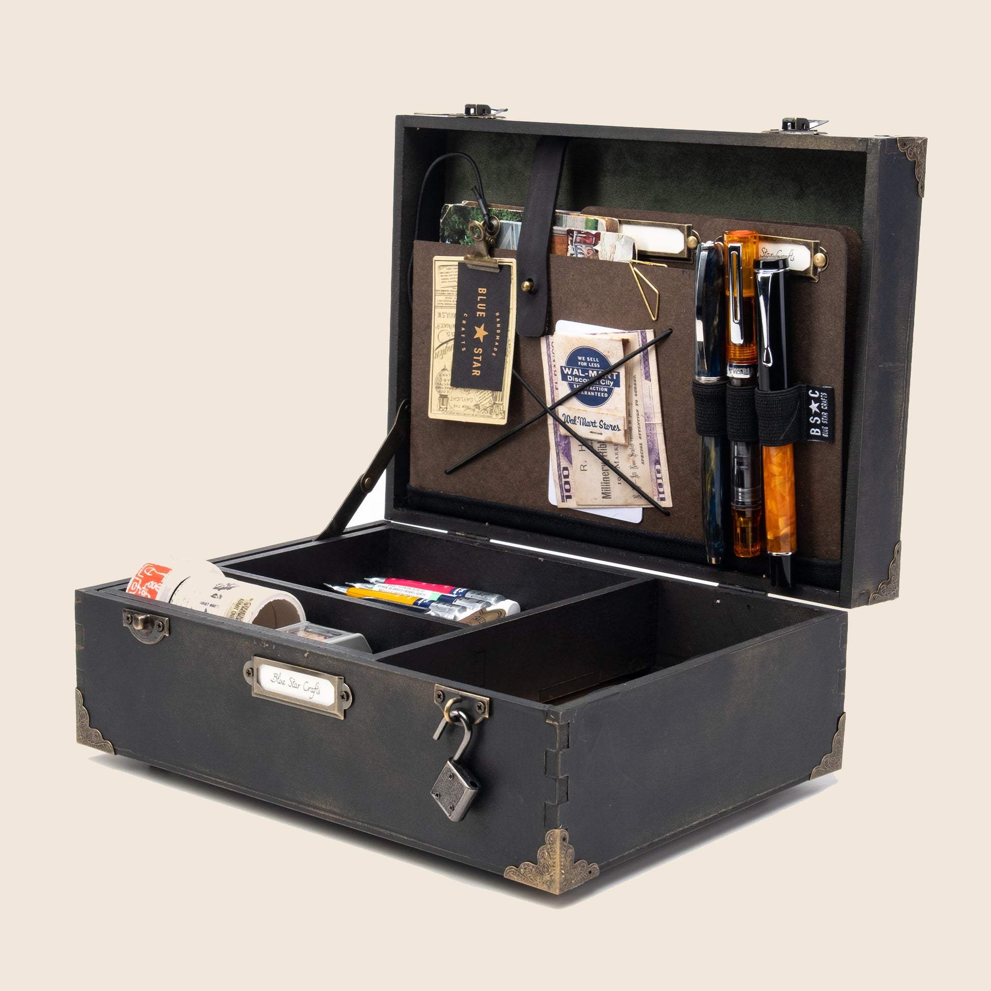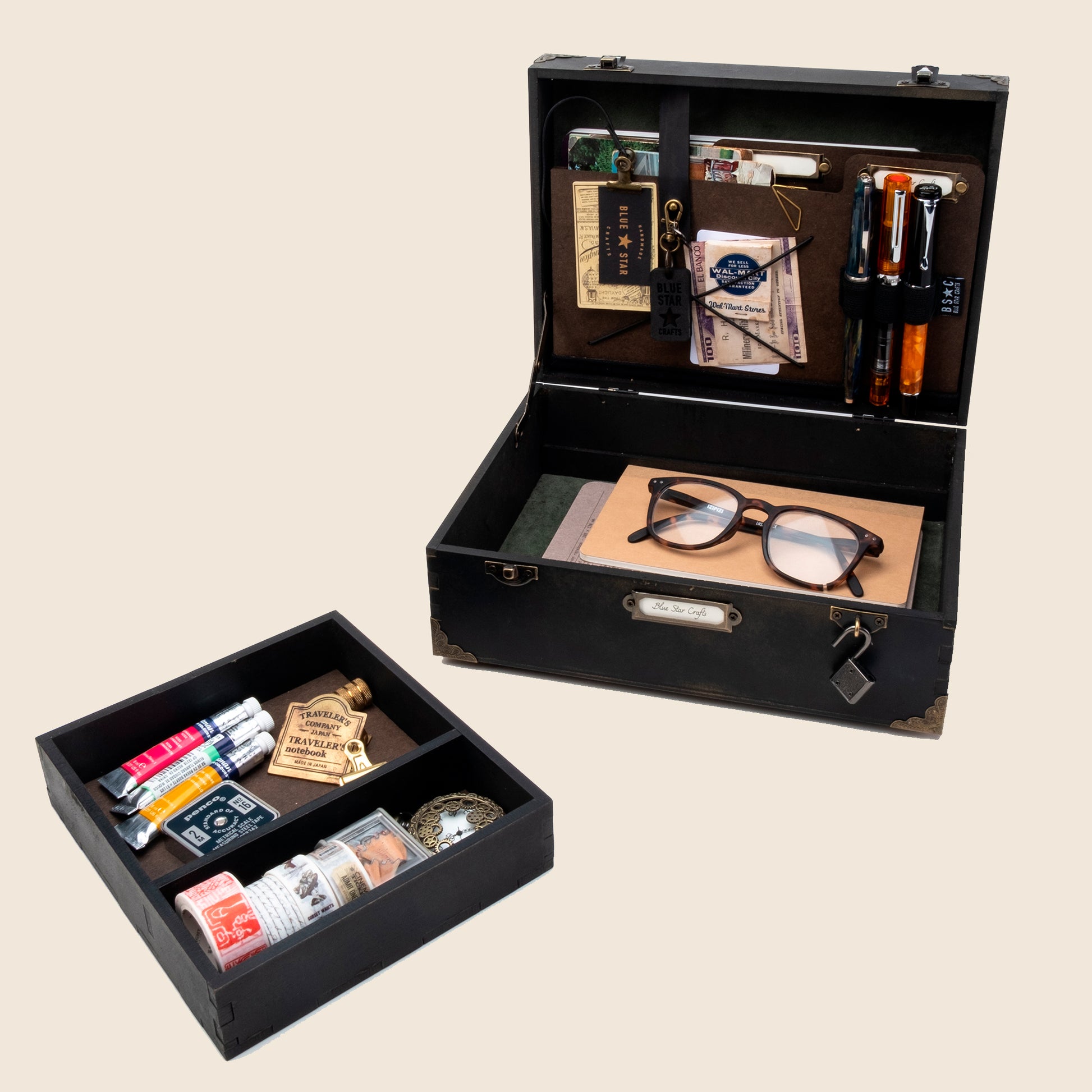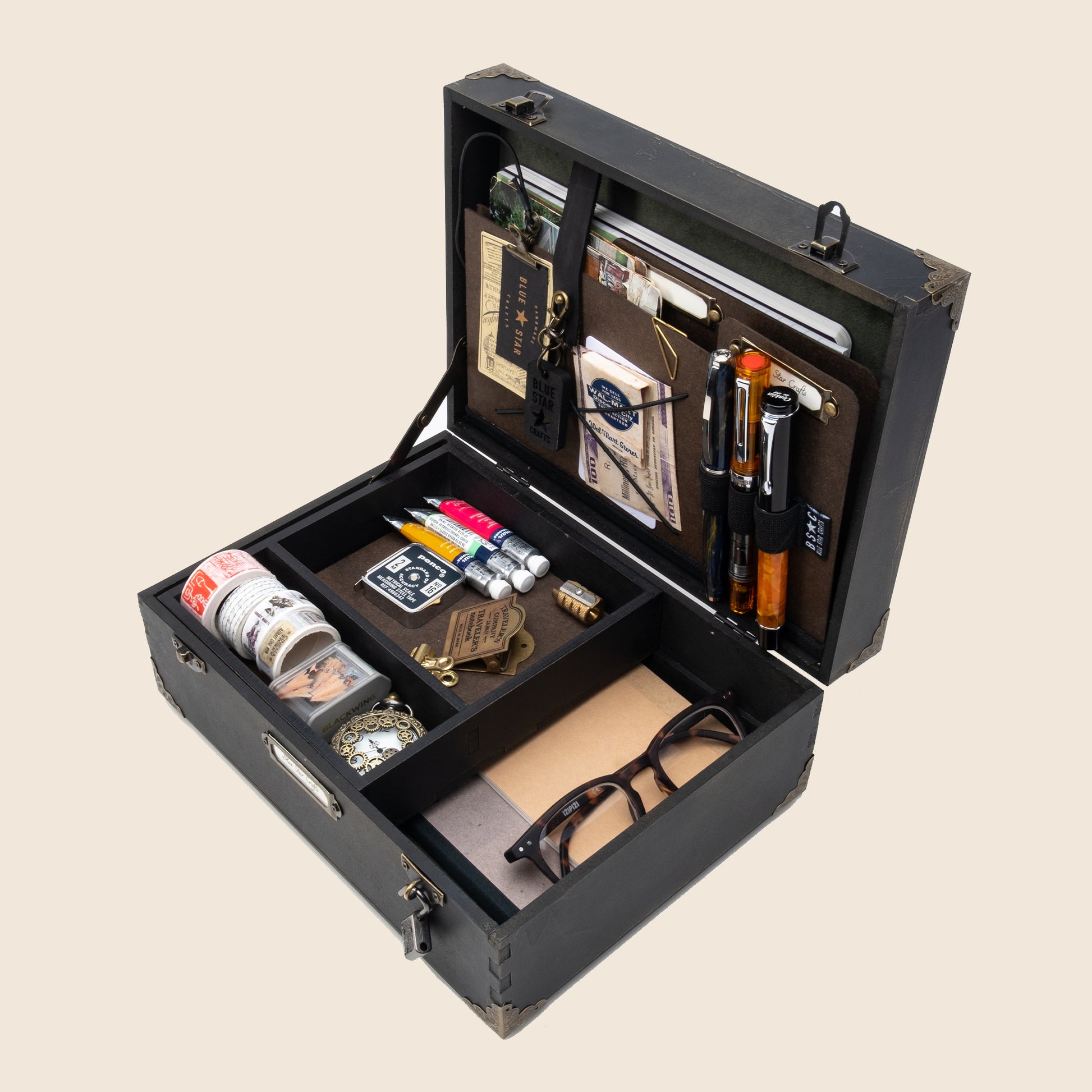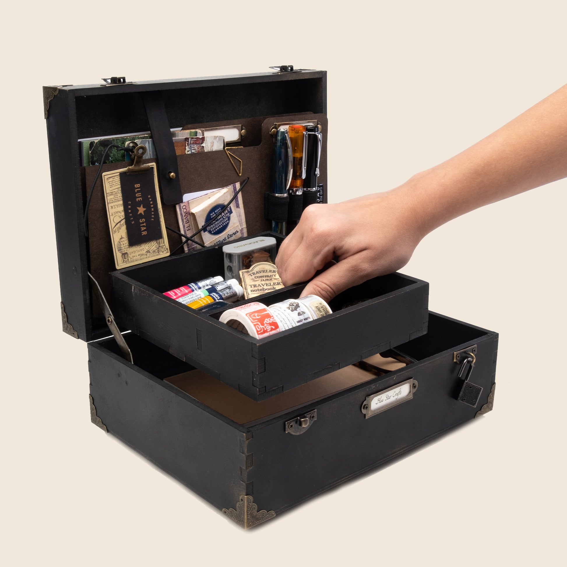 Fantasy and magic sets this treasure/tool box apart because memories, secrets and precious stationery mean a lot to people like us. This box is a place to keep them safe and organized. Inspired in mythical and magical themes from wizard and fairy tales that get us in the same mood to create amazing stories.