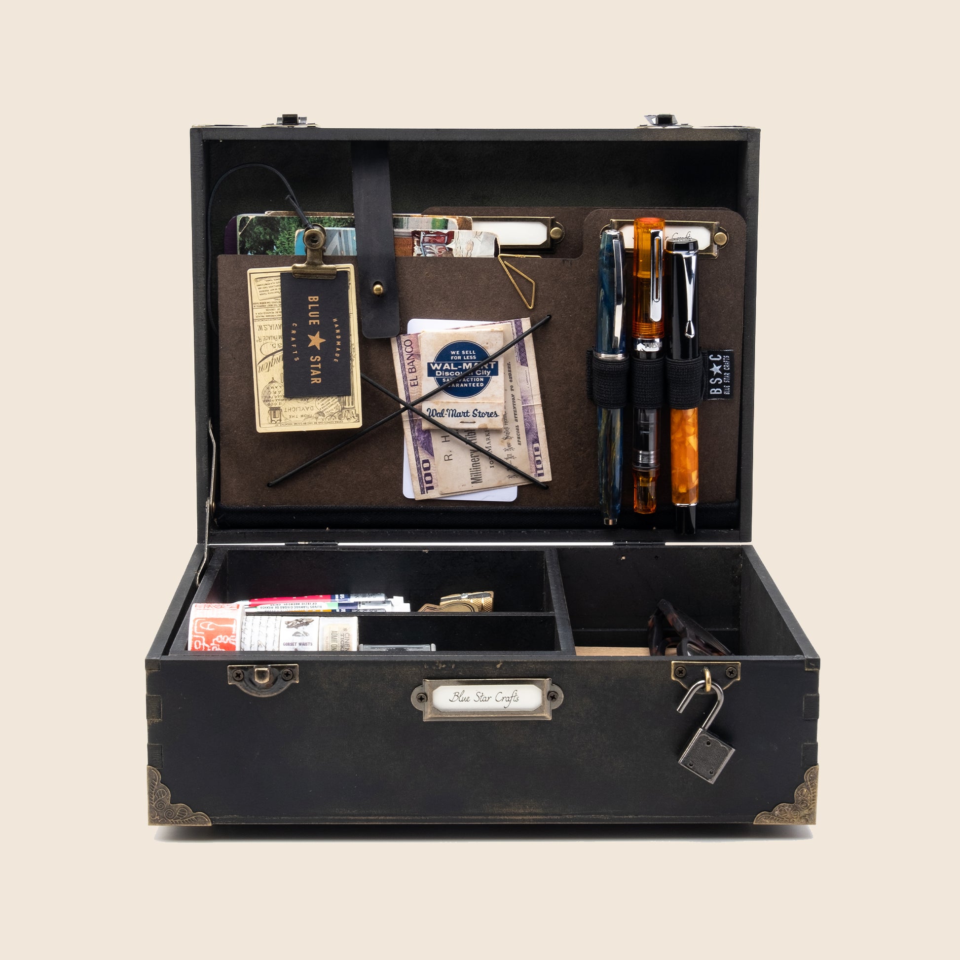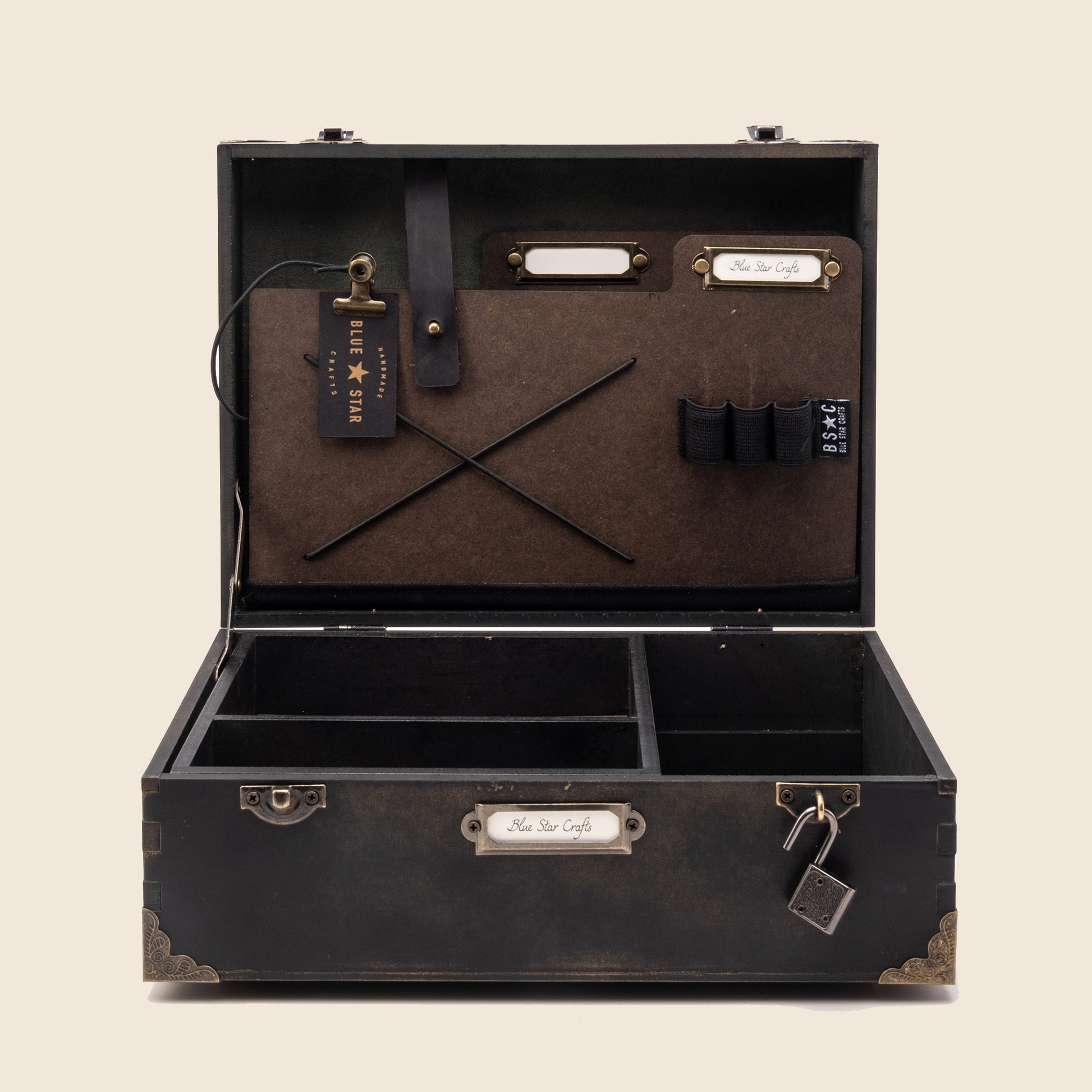 - Two cardboard dividers on top lid for documents or stationary with metal name tags for personalizing